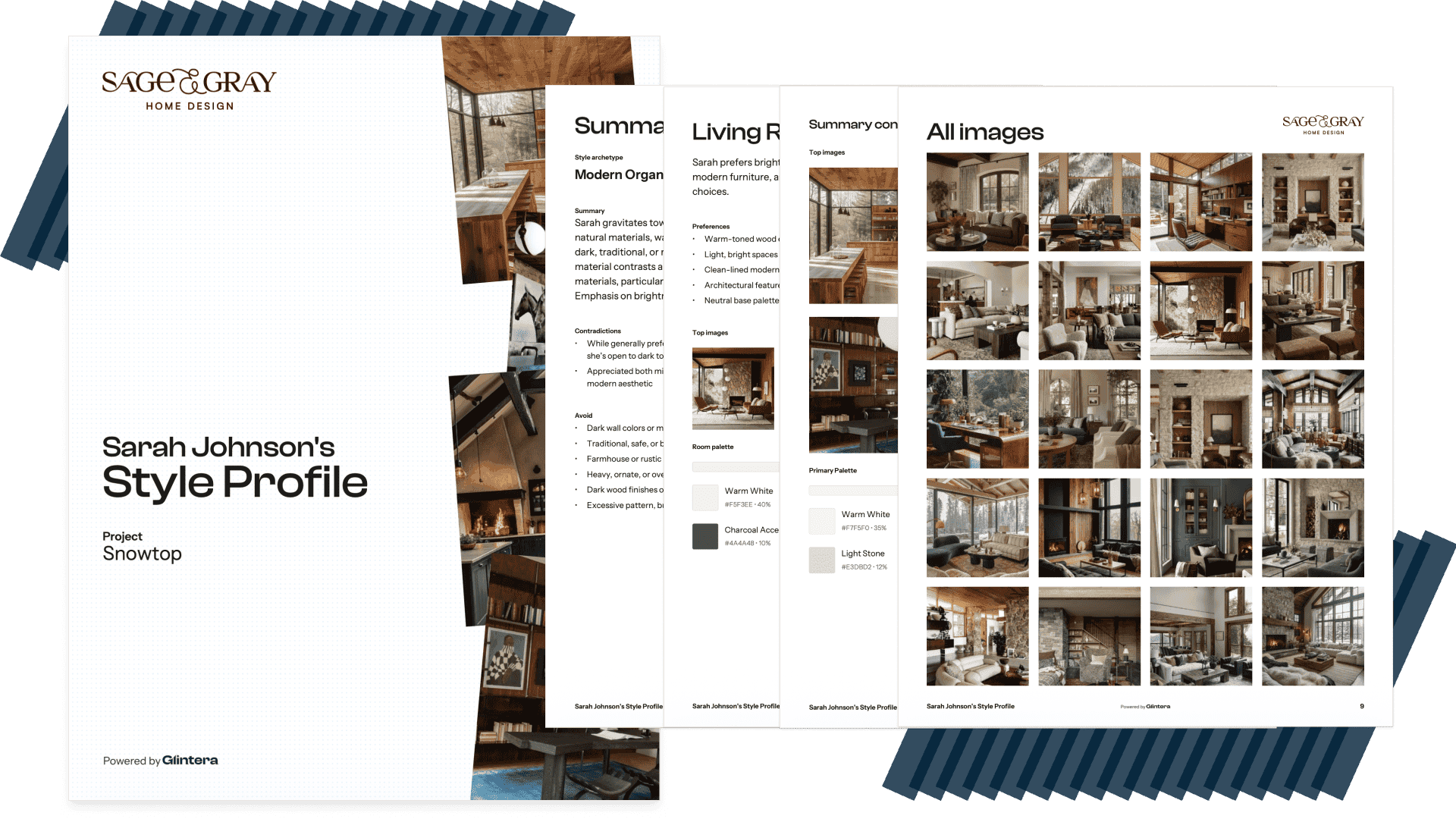 Glintera's Style Profiler closes the gap between what your clients feel and what they can say. You get real creative direction before any design decisions are made. Your client feels genuinely heard, and you both start the project speaking the same language.