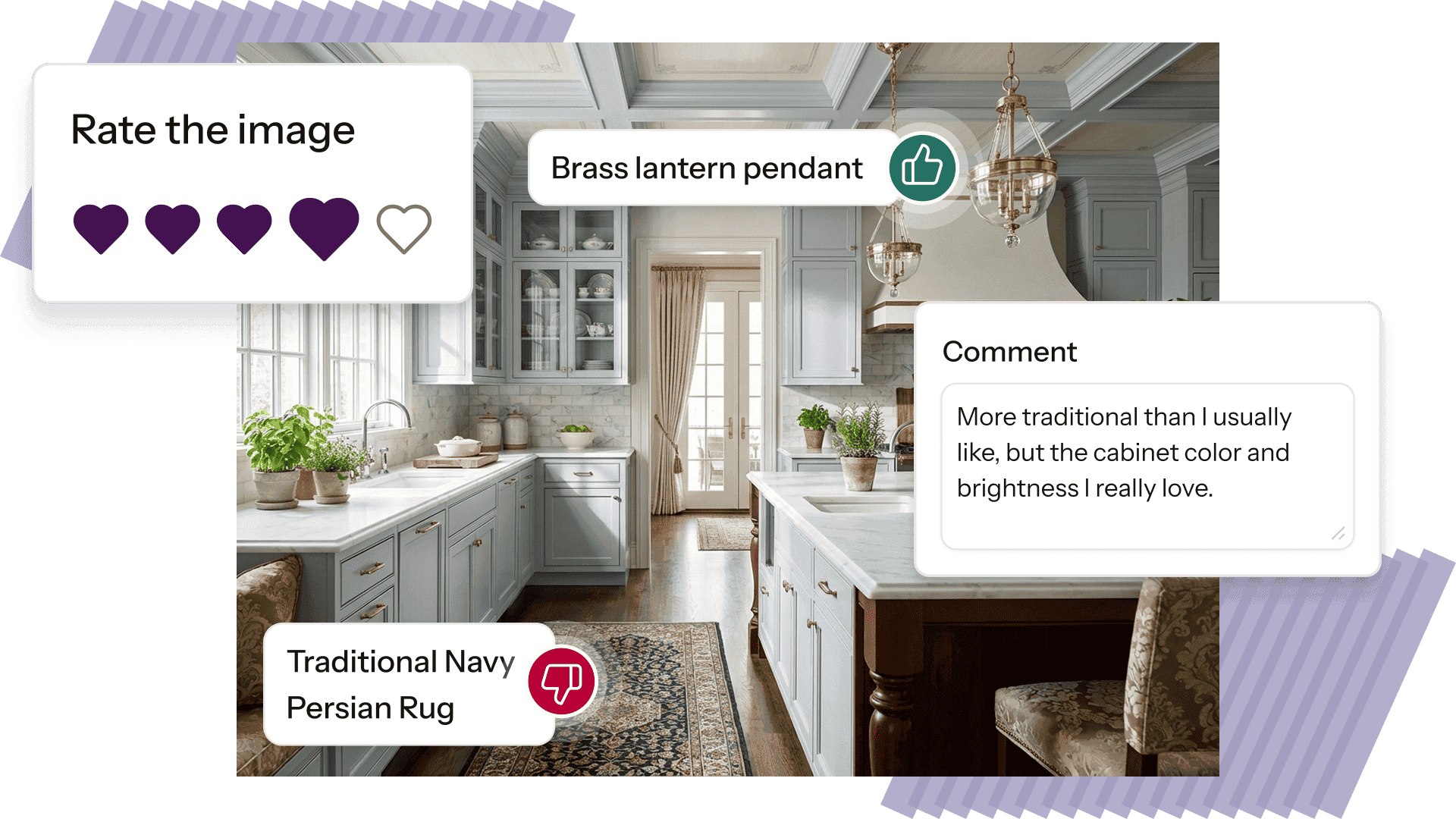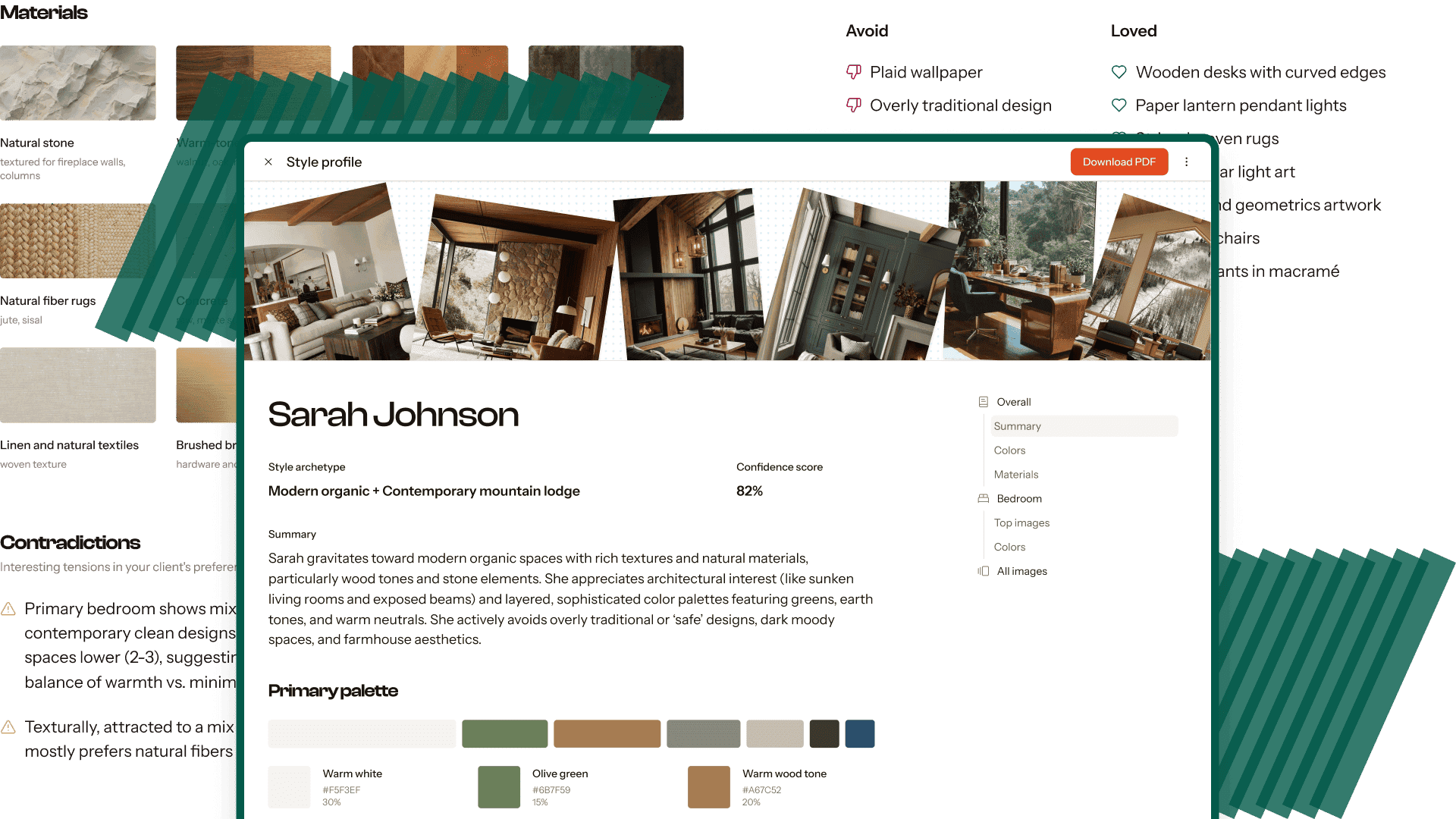 Your clients have strong opinions about what they love — they just can't find the words. Our Style Profiler turns their reactions to inspiration images into a detailed taste profile, so you walk into every project with clarity instead of questions.